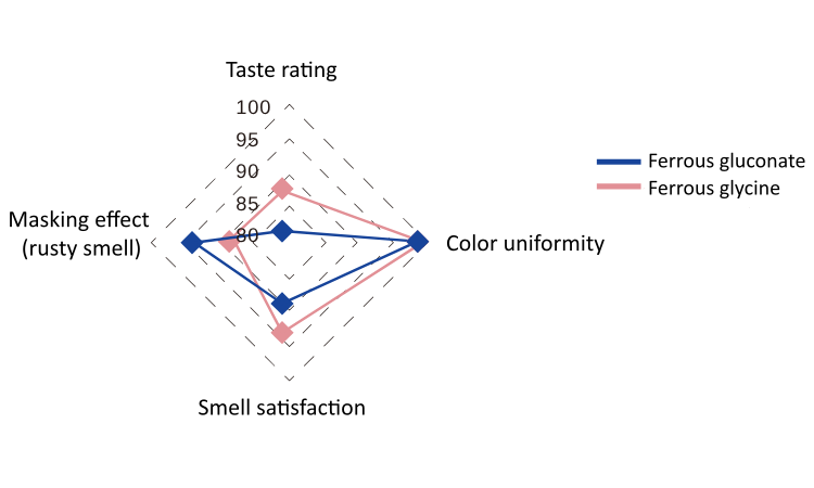 Liposomen-Flüssigeisen schnitten hinsichtlich Geschmack (82/88 Punkte), Farbgleichmäßigkeit (99,5 %), Geruchszufriedenheit (≥89 %) und Geschmacksmaskierungseffekt (≥88 %) hervorragend ab und stellten damit einen sensorischen Durchbruch bei Eisenpräparaten dar.